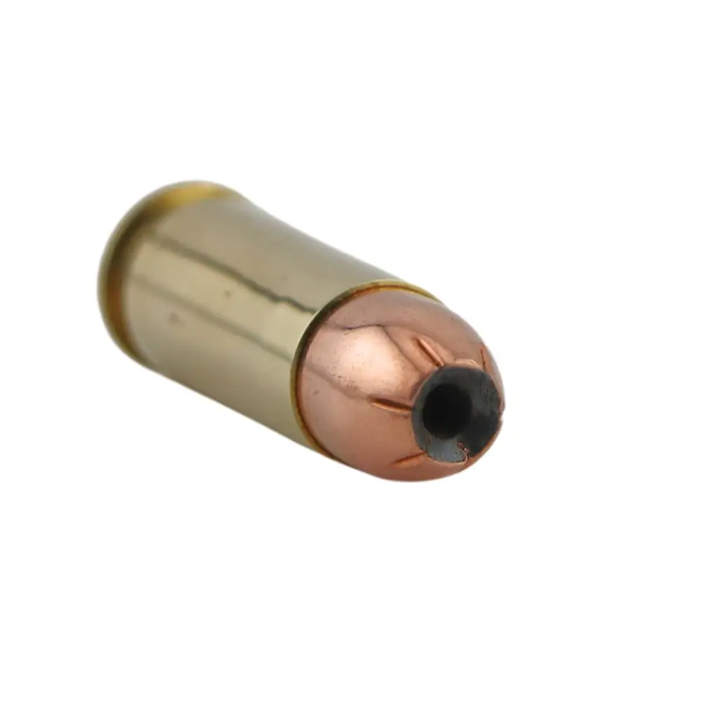 The bullet itself features a soft lead core and a gilding metal jacket. Inside and outside scoring ensures uniform, controlled mushrooming with every shot. It doubles in diameter on contact, peeling back to the base like a classic hollow point should. That’s consistency you can carry with confidence.