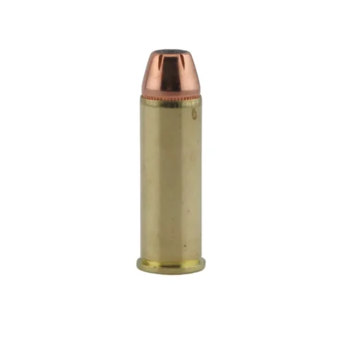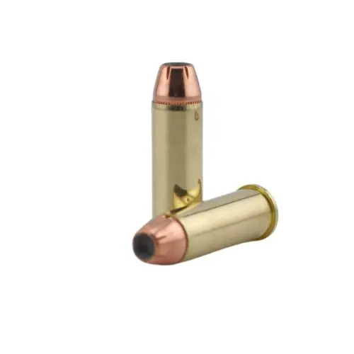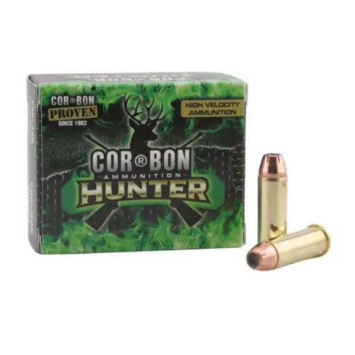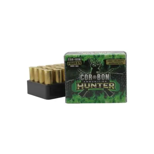 The COR®BON Hunter ammo uses a Jacketed Hollow Point (JHP) made with a gilding metal jacket and a soft lead core. Additionally, the jacket is specially scored inside and out to ensure uniform and rapid expansion. This non-bonded bullet is suitable for both self-defense and hunting light game.