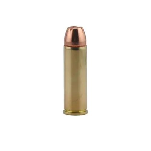 The 240gr JHP bullet features a soft lead core enclosed in a gilding metal jacket. Scoring on the jacket ensures expansion happens quickly and evenly upon impact. As a result, the bullet mushrooms to nearly double its original diameter, creating large wound channels while retaining energy. Because it is a non-bonded bullet, it is tuned for controlled expansion rather than extreme penetration—ideal for medium game and defensive use.